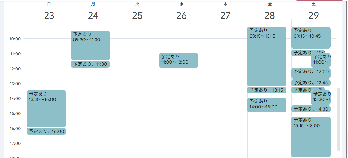 カレンダーを週表記にしていご覧いただくと詳細な時間帯がわかります。