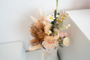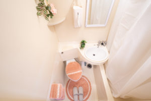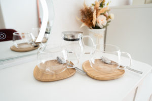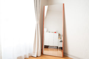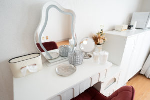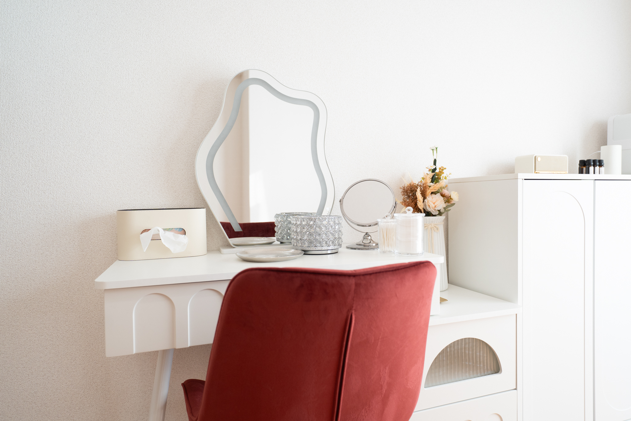 高級感のあるボルドーがポイントカラーのドレッサーです。パフ・綿棒・化粧落としシートが常備されています。